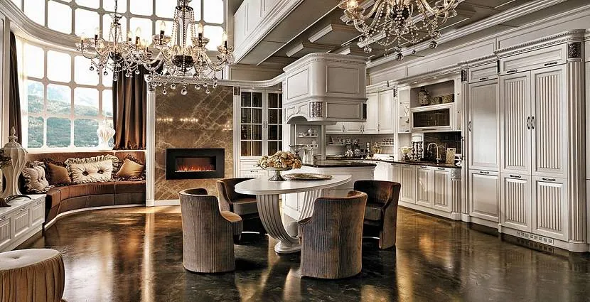 Данный стиль идеально подходит для помещений с большой площадью. Именно в просторных кухнях-гостиных получится в полной мере реализовать все возможности классического направления. Такие комнаты позволяют использовать в качестве элементов декора массивный гарнитур, плотные шторы в пол с комбинированными ламбрекенами сложной формы, круглый обеденный стол, кресла, мягкие уголки. Для большего уюта следует разбить помещение на рабочую, обеденную и зону отдыха. Сделать это можно с помощью продуманной системы освещения и комбинированного напольного покрытия. Пол рабочей зоны может быть отделан плиткой, а остальная часть комнаты – паркетом, качественным ламинатом или плитами другой расцветки и фактуры.