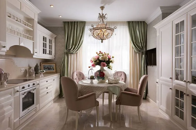 Со стороны обстановка кажется сдержанной и эффектной. Мебель обычно белого или цвета слоновой кости. Светлые шторы со сдержанным рисунком помогут оживить комнату. Для стиля классик характерна белоснежная кружевная скатерть, фарфоровая бежевая, кремовая или белая посуда, декор в виде некрупных статуэток.
