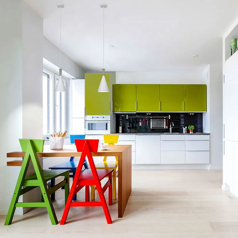 Современная белая кухня задействует не более трёх основных цветов: при большом обилии красок дизайн получится перегруженным. Наиболее распространены два варианта: белый + сочный контрастный цвет и белый + один спокойный цвет + немного яркого акцента.
