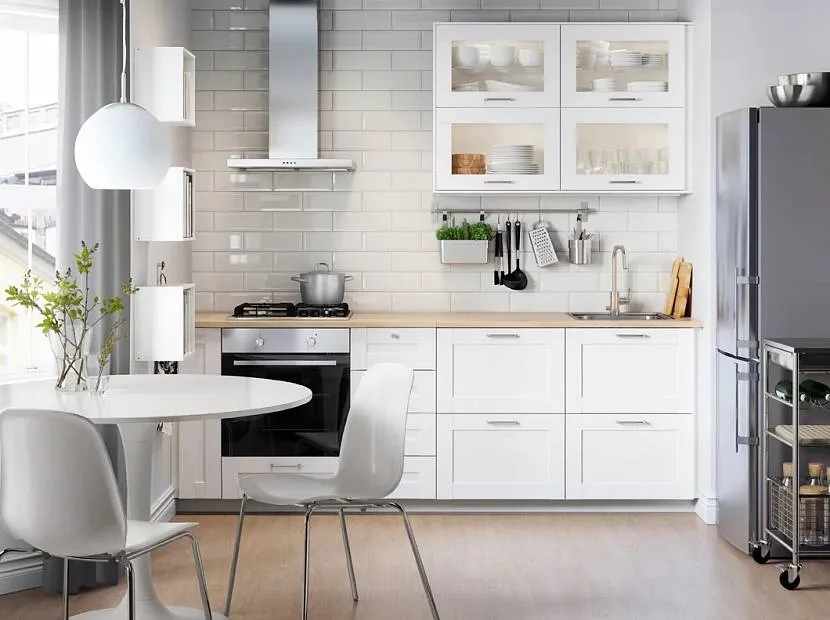 В средних и больше по площади кухнях стеклянные вставки ещё допустимы, но в маленьких будет слишком сильная перегрузка деталями.