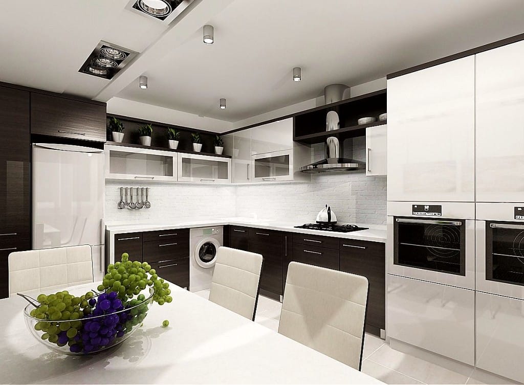 Белый с коричневым – беспроигрышный дуэт и для классики, и для современного стиля. Это может быть шоколадный глянец с белым акрилом или благородное темное дерево с мраморной столешницей. Интерьер кухни получается довольно строгим и спокойным, но в то же время по-домашнему теплым и уютным.