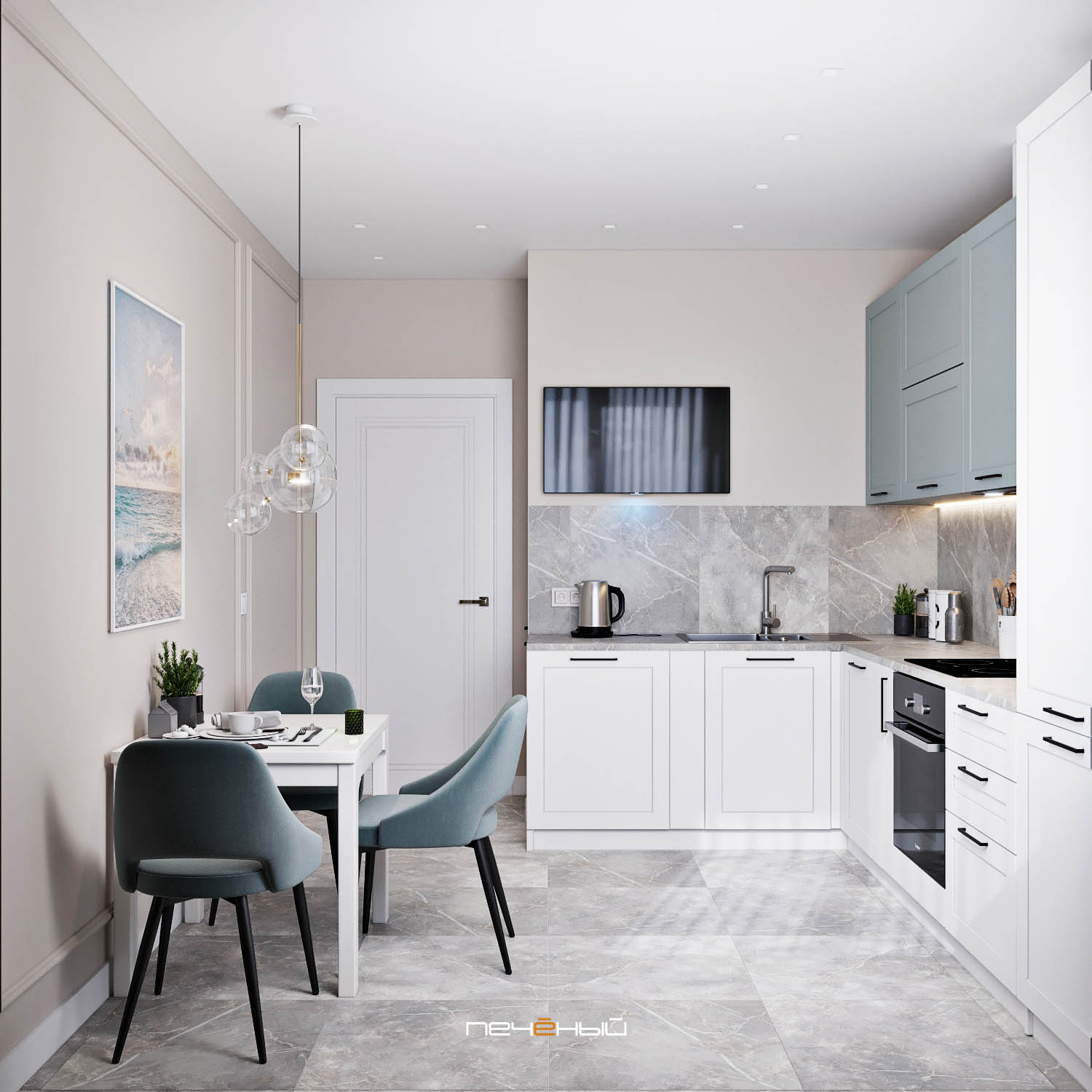 Очень свежий и светлый неоклассический дизайн кухни: современные идеи здесь очень гармонично дополняют классические молдинги. Вообще, немного классических элементов всегда классно смотрятся в современном стиле и освежают его, будь то красивая люстра или, как в нашем случае, молдинги.