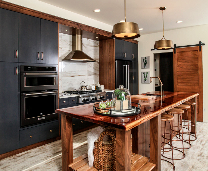 - Черный можно выбрать из ряда материалов натурального происхождения, таких как мрамор, древесина или гранит. Такой выбор особенно важен для поклонников здорового образа жизни и экологичности.