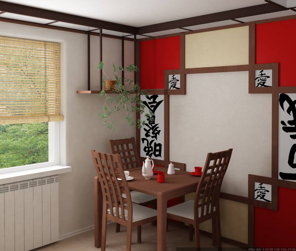 К особенностям японского оформления также можно отнести светлую цветовую гамму, ровные конфигурации, минимальное количество плавных форм. Для выделения восточной тематики многие декорируют кухонное помещение тематическими художественными полотнами, активно используют в декоре иероглифы.