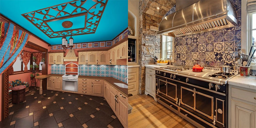 Религия влияет на поступки человека и на то, чем он окружает себя. Это заметно по арабскому стилю, который является представителем восточного направления. В интерьере кухни нет изображений или статуэток животных и людей. Приветствуется мозаичная графика и орнаменты в виде геометрических фигур. Флористическая тематика приближает к природе, поэтому присутствует на текстиле и поверхностях. Кухня в арабском стиле имеет обозначенный центр, от которого расставляется мебель. В помещении с таким интерьером нет распашных дверей. Проем обрамляется аркой, что увеличивает пространство.