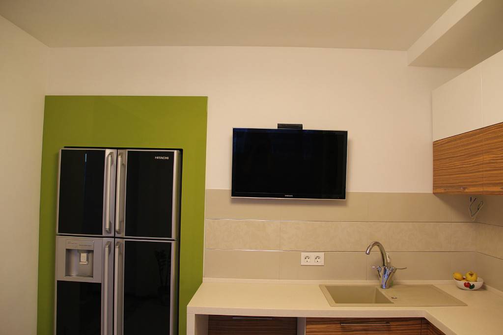 Допускаются яркие оттенки в некоторых предметах бытовой техники — ярким и глянцевым может быть холодильник, электрочайник, микроволновая печь. Такие цветовые акценты придадут помещению оригинальности и вдохнут в него жизнь.
