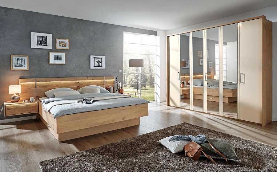 Наборы для спален включают двуспальную кровать, две тумбы, четырехстворчатый шкаф, комод, панно с зеркалом. Кровати комплектуются ортопедическими матрасами. Спальни из Германии изготавливаются с применением дерева, шпона, стекла, лакового покрытия. Они полностью соответствуют европейским требованиям по качеству и экологичности.