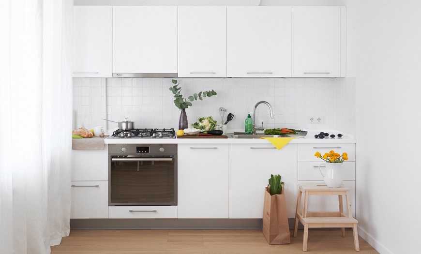 «ИКЕА» предлагает несколько вариантов фасадов в белом исполнении: «Будбин» с филенками и стеклянными вставками на верхних фасадах, минималистичный «Овербу», «Хитарп» с вертикальными полосками. Такие кухни уже несколько лет не выходят из моды. Если со временем лаконичный дизайн надоест, можно добавить несколько ярких акцентов.