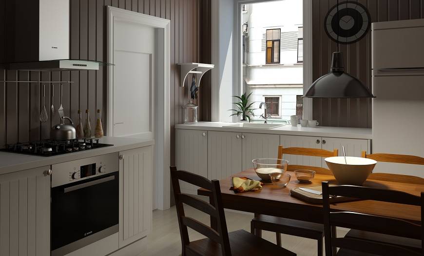 Для маленькой кухни лучше выбирать фасады светлых оттенков (белый, серый, под дерево)
