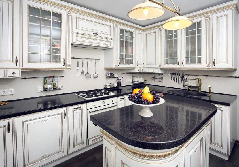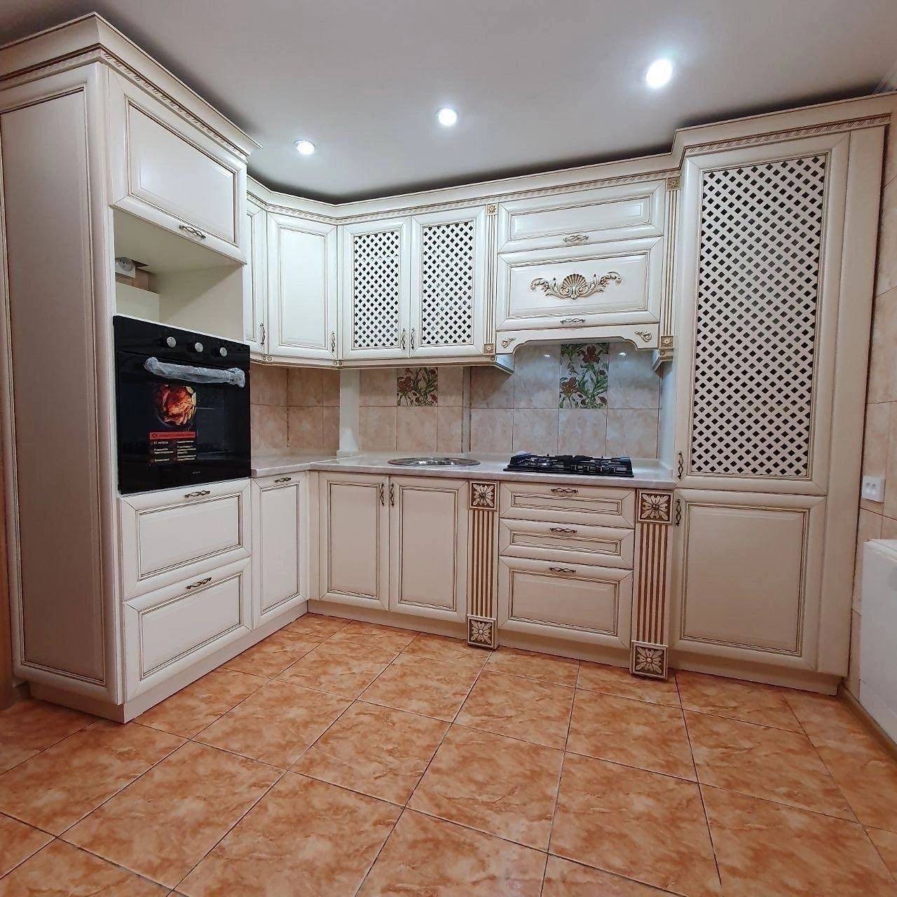 Кухни в классическом стиле отличаются обычно рыжая или темная. Фасады с декоративной фрезеровкой или витражными рисунками на стеклах. Столешница лучше всего под камень.