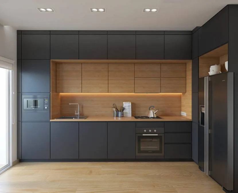 Матовую поверхность черного фасада прекрасно дополнит деревянная столешница, а также направленное теплое освещение.