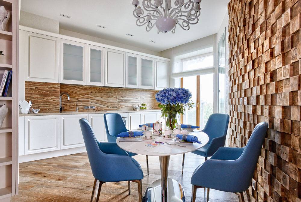 Есть еще один классический прием сочетания с деревом — это белый и черный. При чем, если хотите более уютный и теплый дизайн интерьера кухни, тогда используйте белый. А если душа требует брутальности и выраженной стильности, тогда добавьте черного. Иногда достаточно добавить черных стульев, чтобы кухня прибавила изыска. И тогда черный акцент станет основным фокусом внимания на кухне.