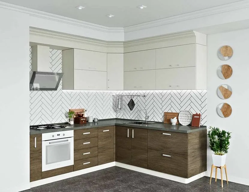 В скандинавском стиле кухня стандартно белая, но вы можете заказать деревянную столешницу, а также верхний ряд шкафов.