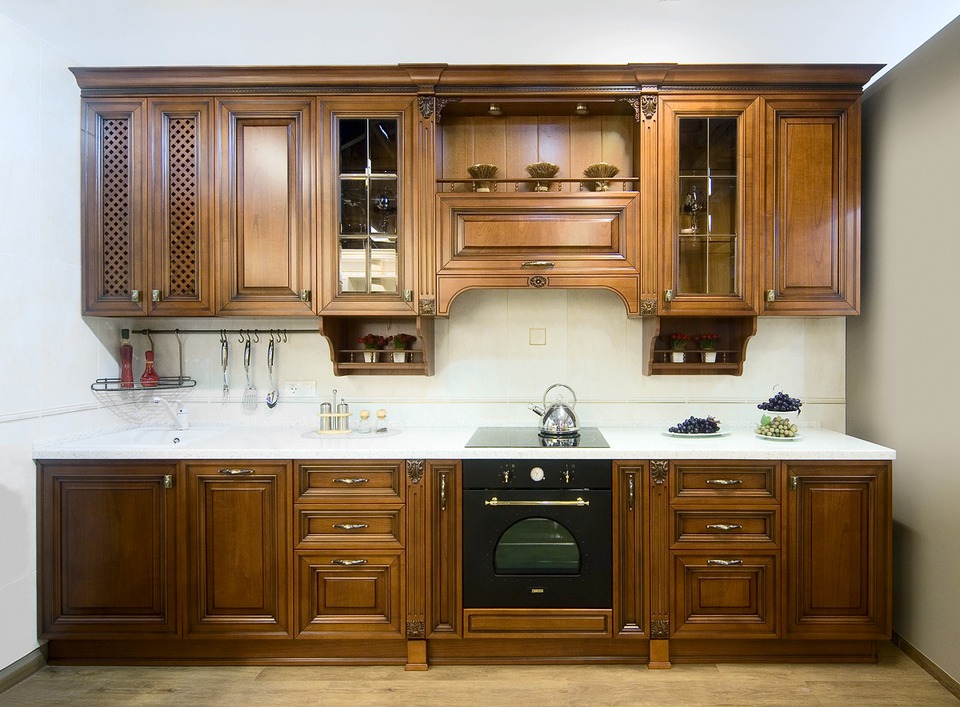Наиболее распространенным является классический. Кухни из дерева в этом стиле, как правило, имеют плавные, округлые фасады с нанесенными на них контурными рисунками. Фронты, при этом, могут содержать фигурные детали, карнизы, пилястры. Основные цвета классического стиля – белый, бежевый и коричневый, а также их оттенки (шоколадный, коньячный, ореховый и прочие). В некоторых вариантах могут присутствовать оттенки синего и зеленого цвета.