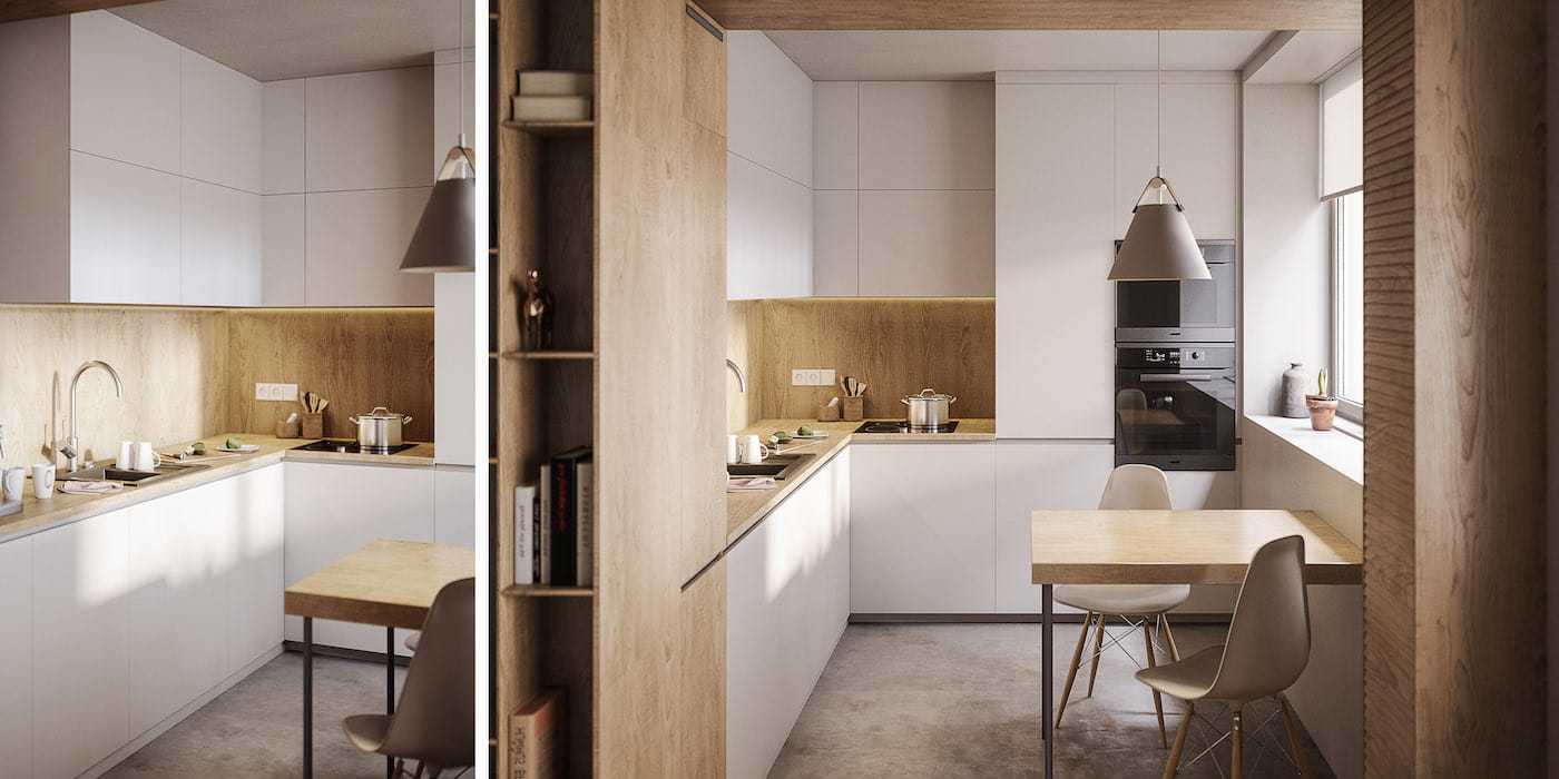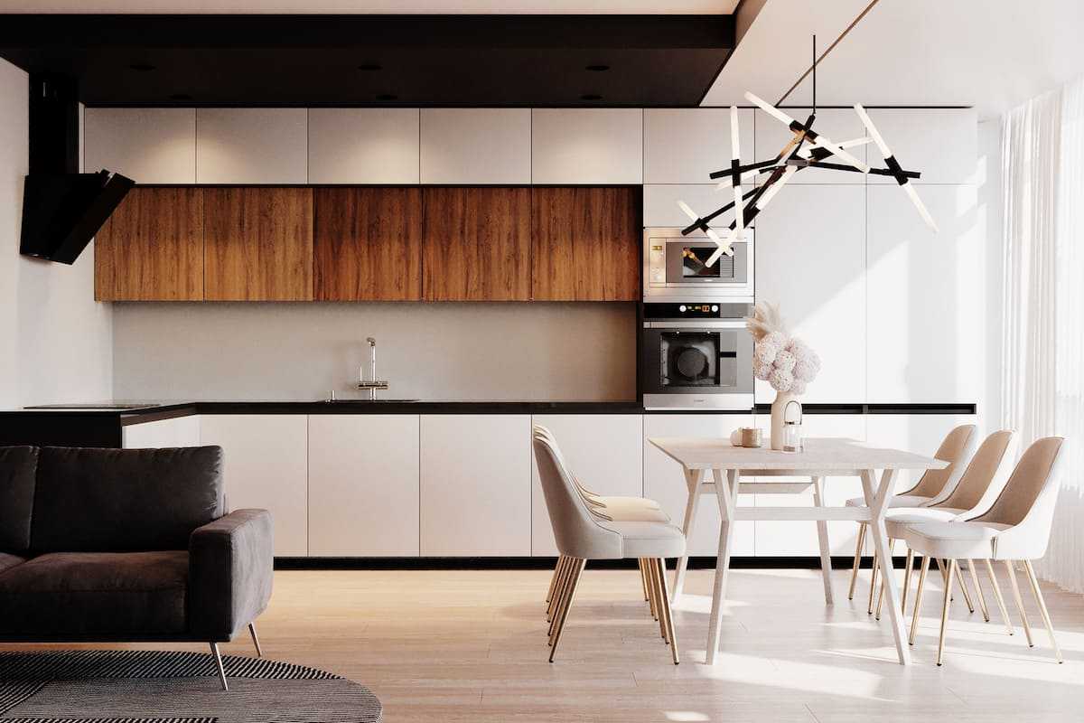 Такой вариант оформления гармонично вписывается в самые маленькие помещения. Выбирают прозрачные или полупрозрачные фасады — они визуально увеличивают кухню. Не рекомендуется использовать обильно декорированные поверхности: отдайте предпочтение гладким и ровным.