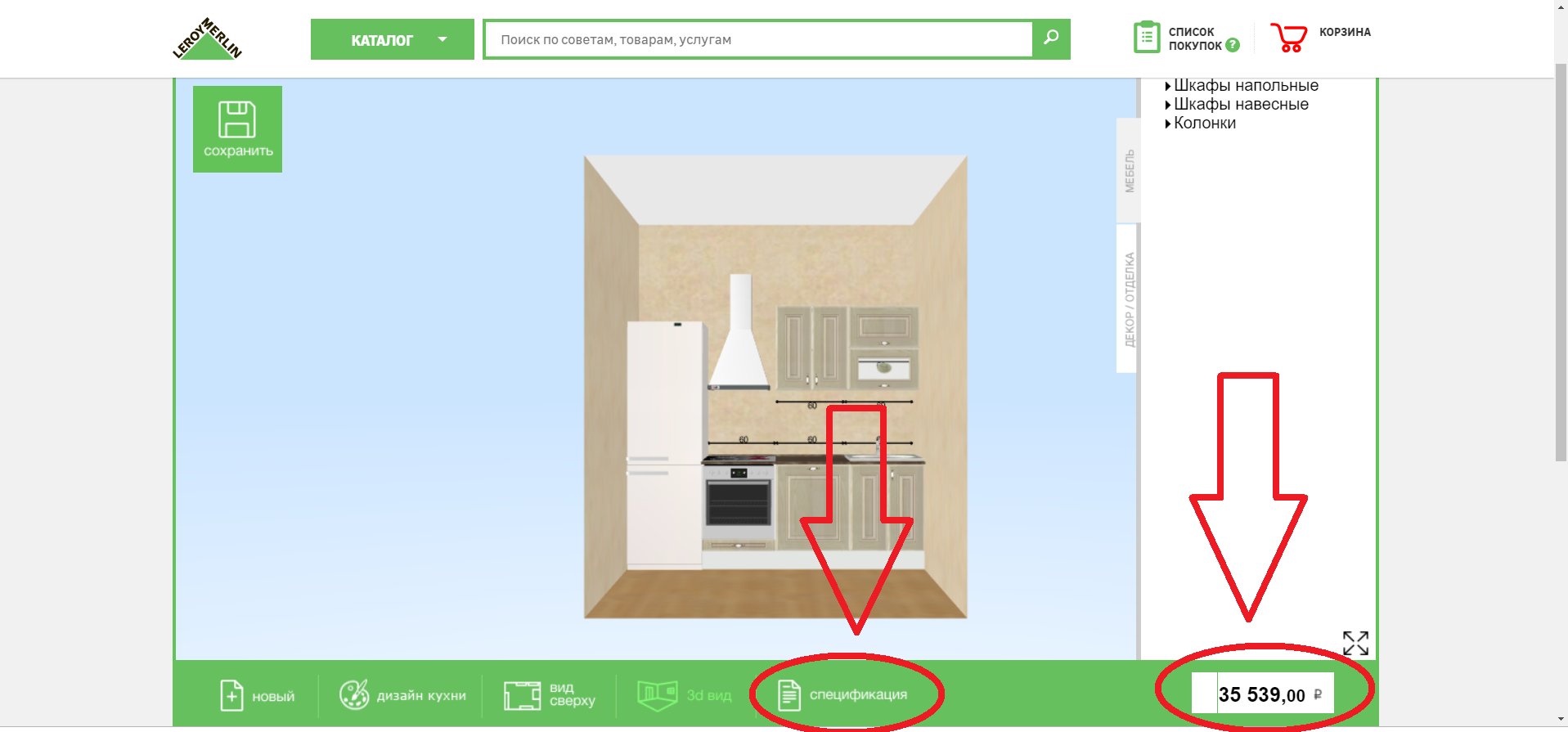 По итогу проектирования программа выдаст полный набор модулей и комплектующих, которые необходимы для готовой кухни, а также полную стоимость проекта. Если вы проектируете самостоятельно, то посмотреть цену можно в правом нижнем углу или открыв спецификацию.