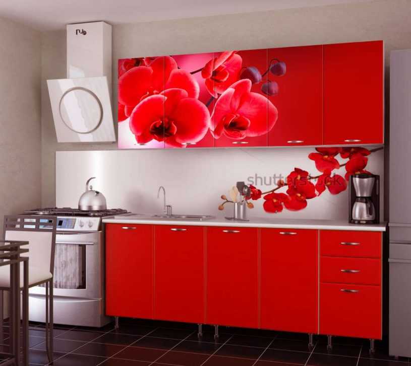 Максимально возможный вариант – размещение однотипных фотографий на фасадах кухонной мебели и на фартуке!