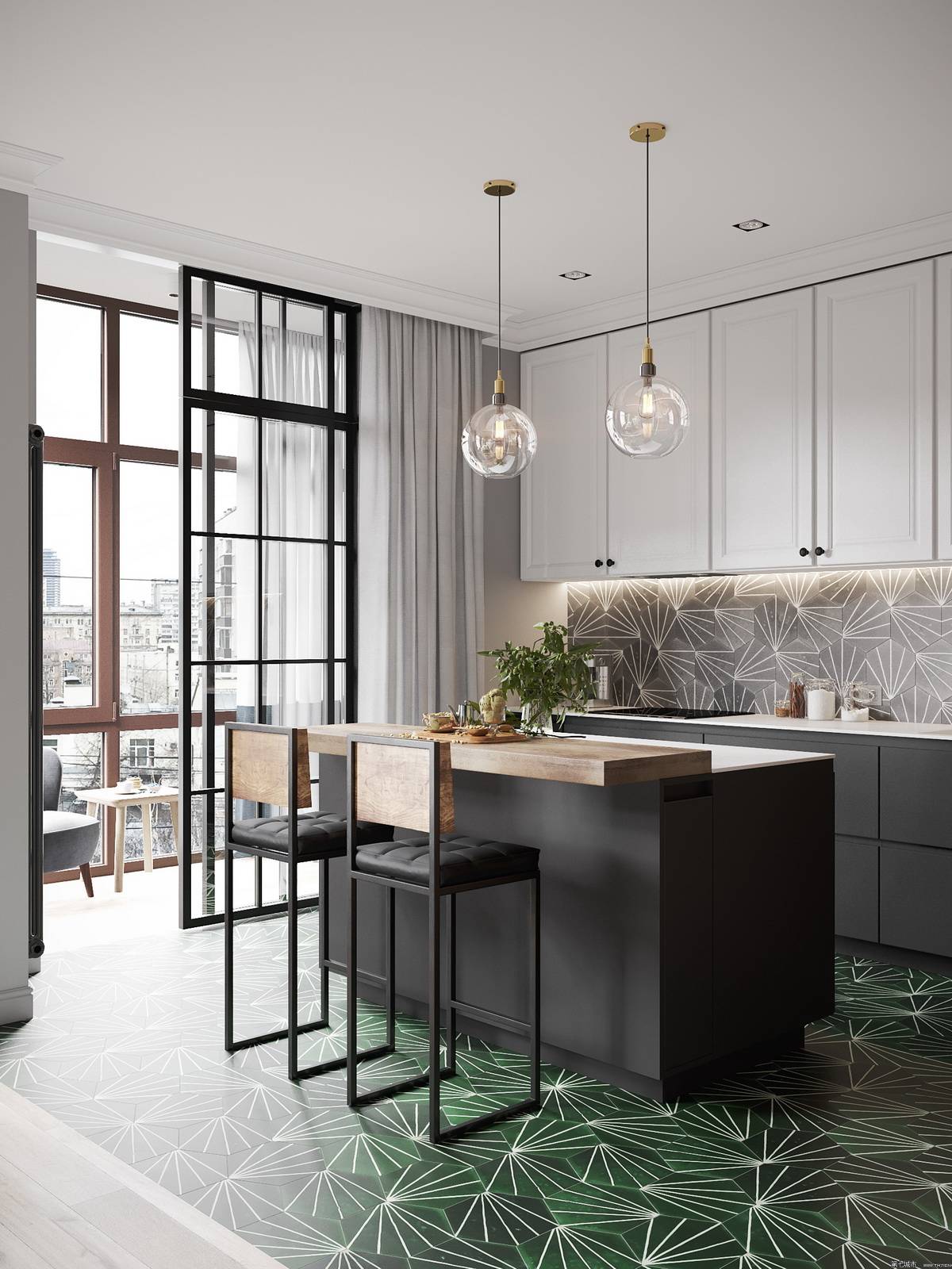 Если кухня большая, зонировать пространство можно с помощью сочетаний плитки разных фактур и цветов на полу, «фартука» с геометрическим орнаментом на стене, который будет лишь немного ярче, чем другие стены.