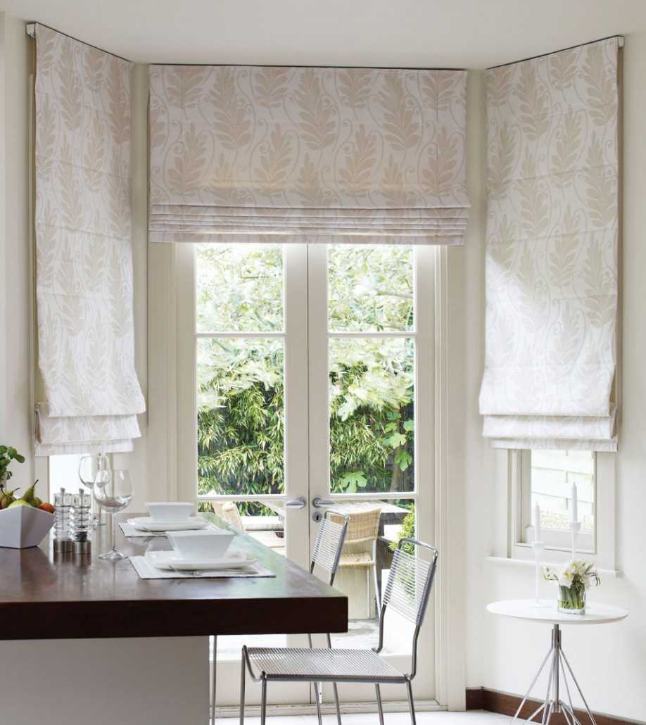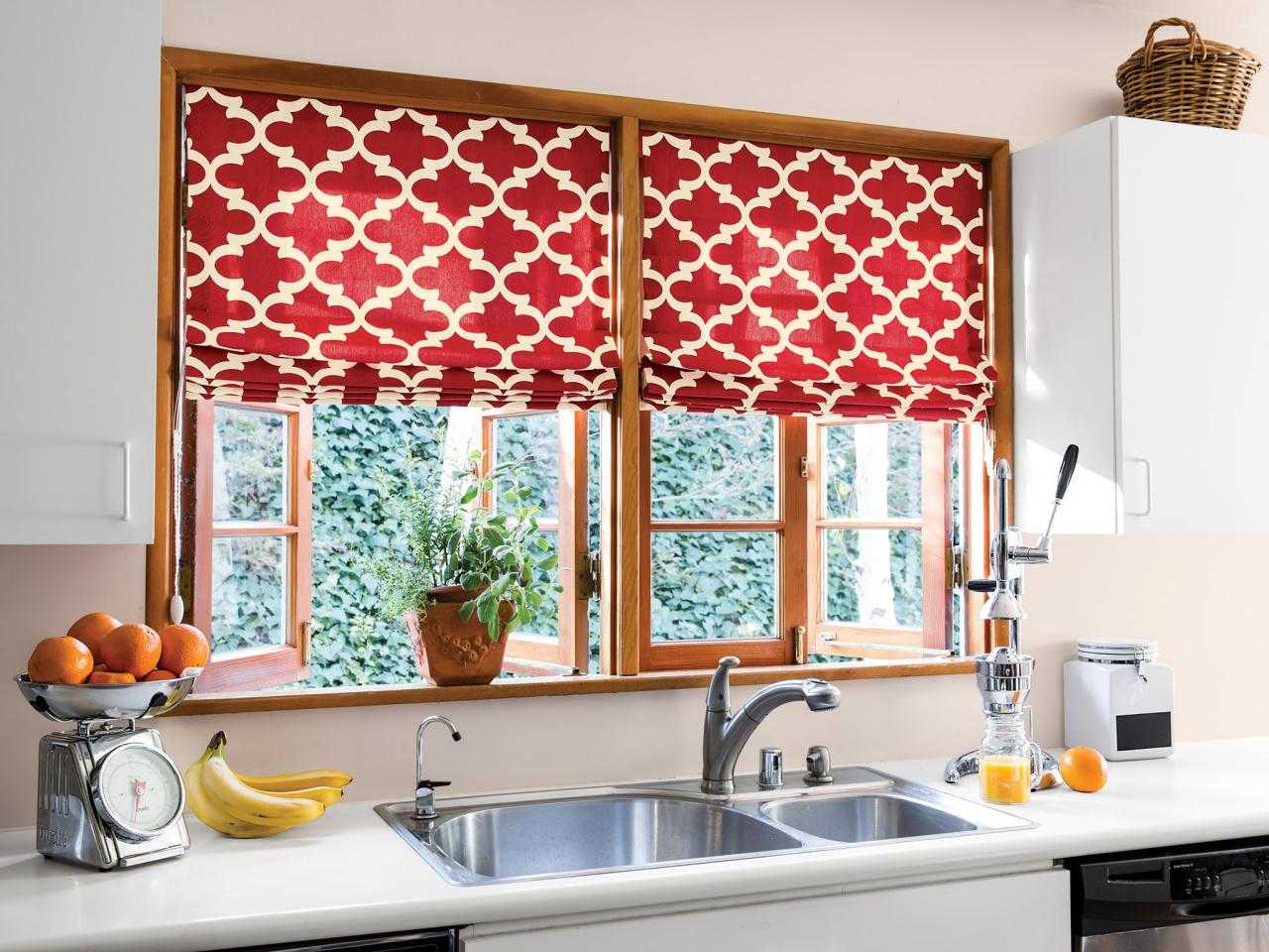 Полотно не обязательно должны быть в одной цветовой гамме. Если дизайн самой кухни сдержанный и гармоничный, на римских шторах может присутствовать узор или яркие цветовые вкрапления. С помощь таких штор можно подчеркнуть геометрию пространства.