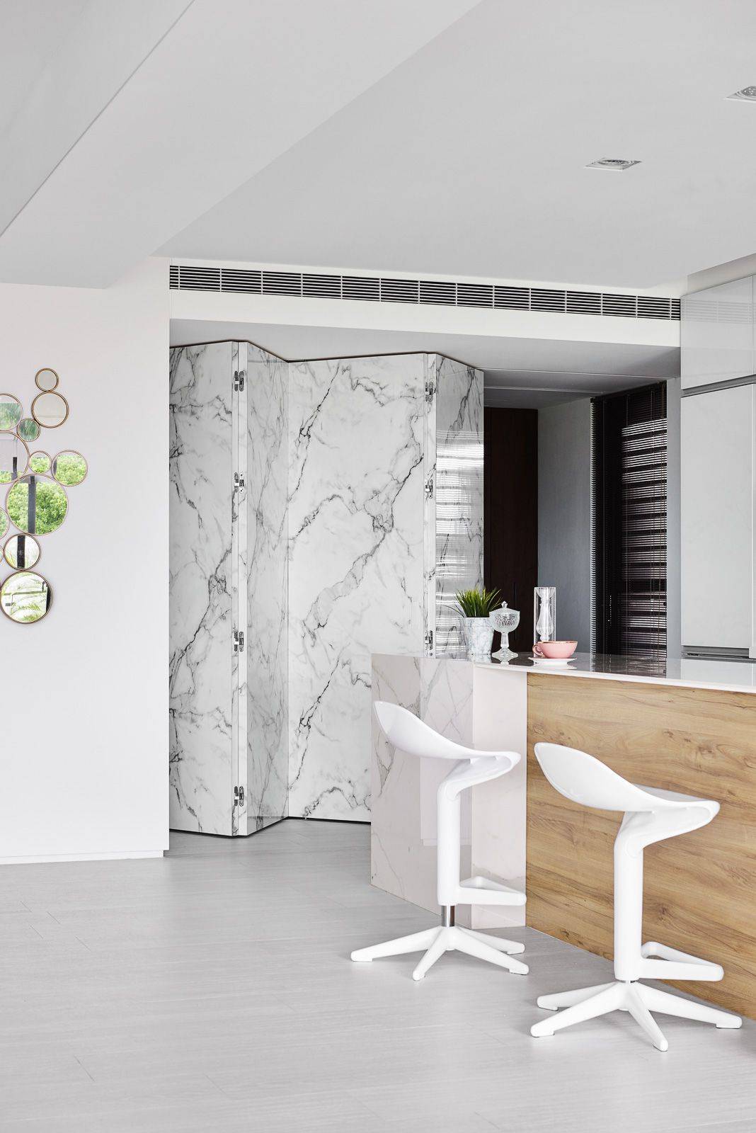- Яркость создаёт переливающийся на свету мрамор. Всё это стабилизируют строгие серые элементы.