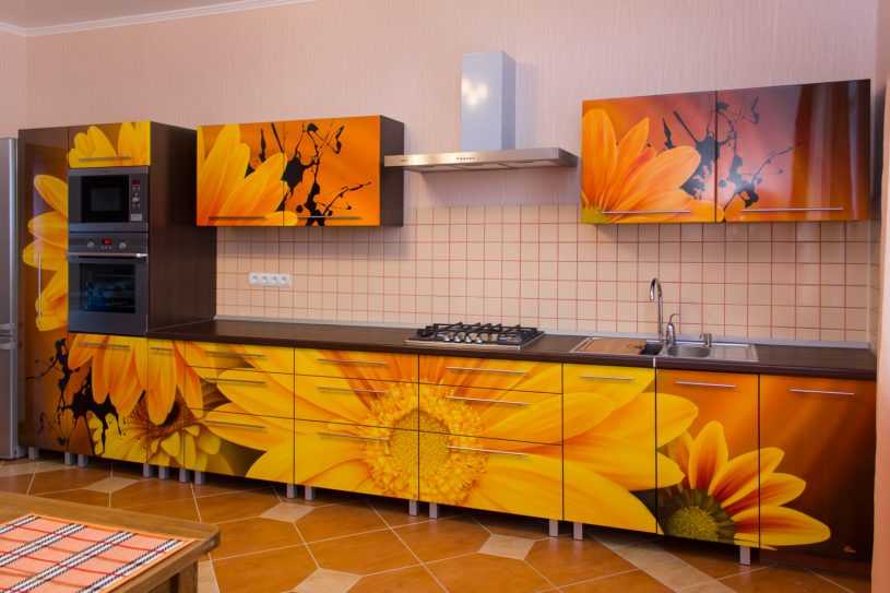 Если кухонная мебель по функциональности и габаритам вас устраивает, не стоит ее менять. Достаточно заменить стандартные фасады и дверцы на фасады с фотопечатью и помещение сразу преобразится. Как обновить мебель читайте в статье “Кухонный гарнитур своими руками”.