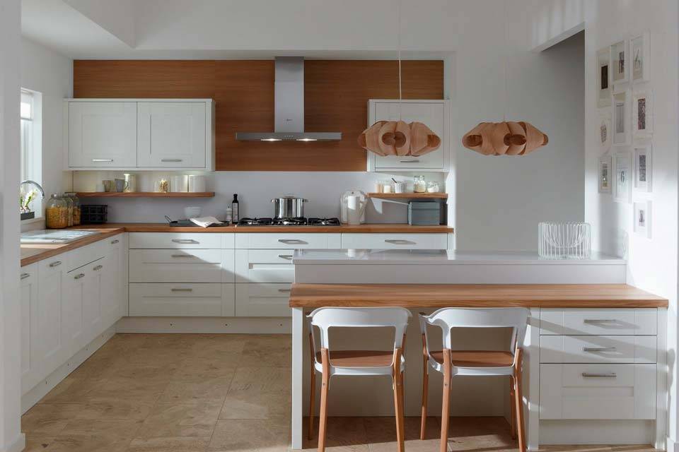 Стильная белая угловая кухня с полуостровом