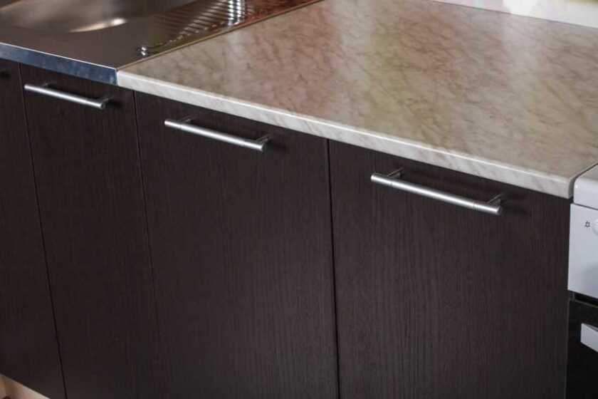 - Приобретая столешницу в другом магазине, имейте в виду, что глубина напольных шкафов гарнитуров Леруа Мерлен составляет не стандартные 60 см, а чуть меньше – 56 см.