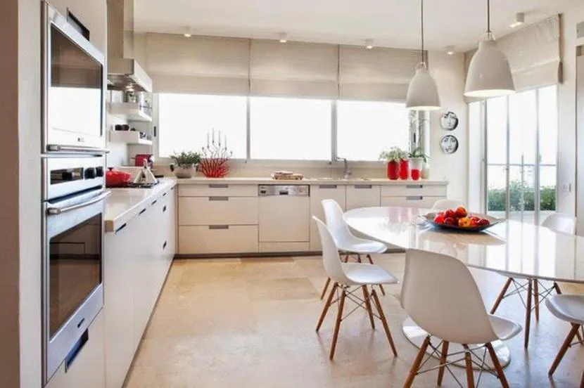 Если вы предпочли моноцветный интерьер, рекомендуем все же добавить несколько акцентов. Характерные для модерна цвета — красный, синий, терракотовый, нежный лавандовый. Всего несколько деталей и даже одноцветная кухня будет выглядеть очень свежо и оригинально.