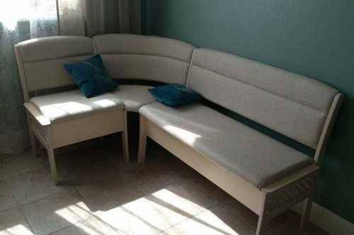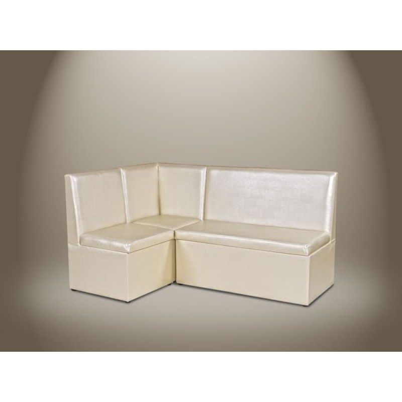 Угловой вариант дивана для кухни с округлыми формами и с наполнителем из пенополиуретана. Он как нельзя лучше подходит для кухонь, так как обивка выполнена из искусственной кожи. Это очень практично, так как она не впитывает влагу и с нее легко удалить все загрязнения, которых на кухне более чем достаточно.