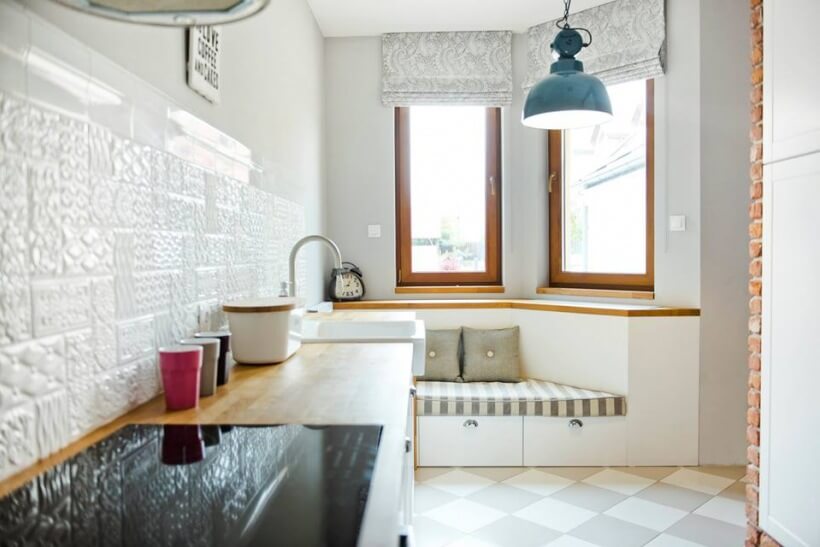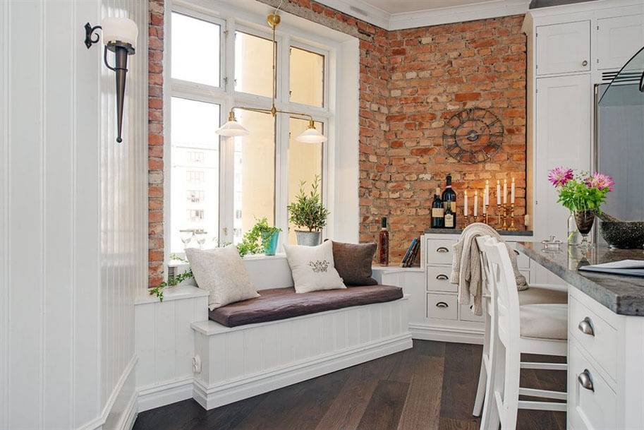 - Если у вас маленькая кухня, то лавка может быть лучшим решением. Она экономит место и визуально расширяет пространство. Вы можете прикрепить скамью к стене, чтобы вывести ее за пределы кухни и использовать ее в других помещениях.
