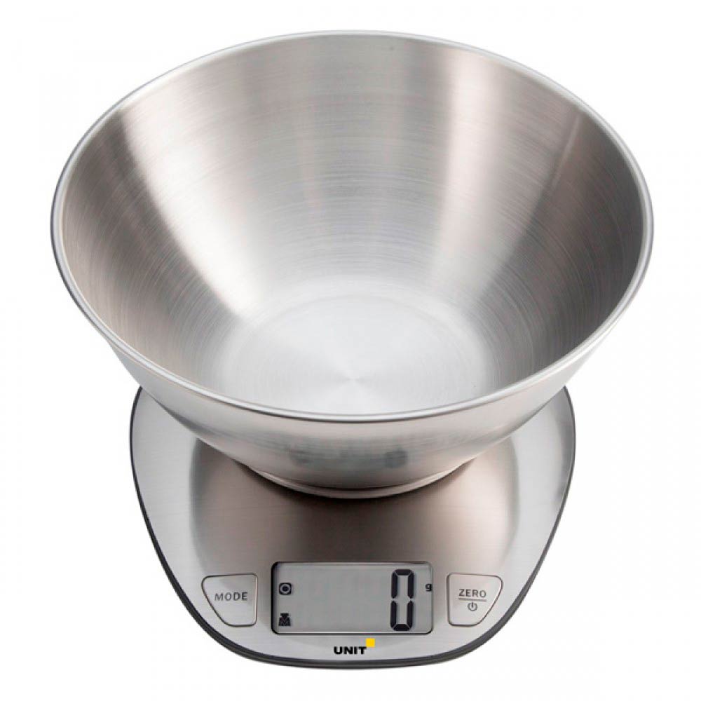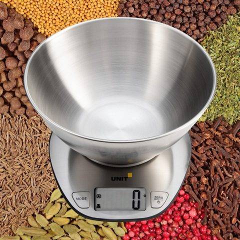 Недорогая модель с электронным интерфейсом. Максимальная нагрузка – 5 кг. В комплекте есть съёмная тара из пластика объёмом 2,5 литра. UNIT UBS-2155 определяют значение тяжести продуктов с погрешностью до 1 грамма.
