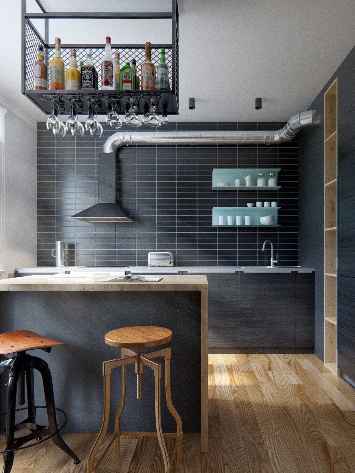 Дизайн кухни зависит от ее размеров и планировки. Если она включает в себя обеденную зону, то обои под кирпичную кладку стоит клеить именно там, тем самым очертив границы. В маленьких кухнях можно применить их на всю рабочую стену или только фартук, для надежности спрятав его за стеклянной перегородкой.