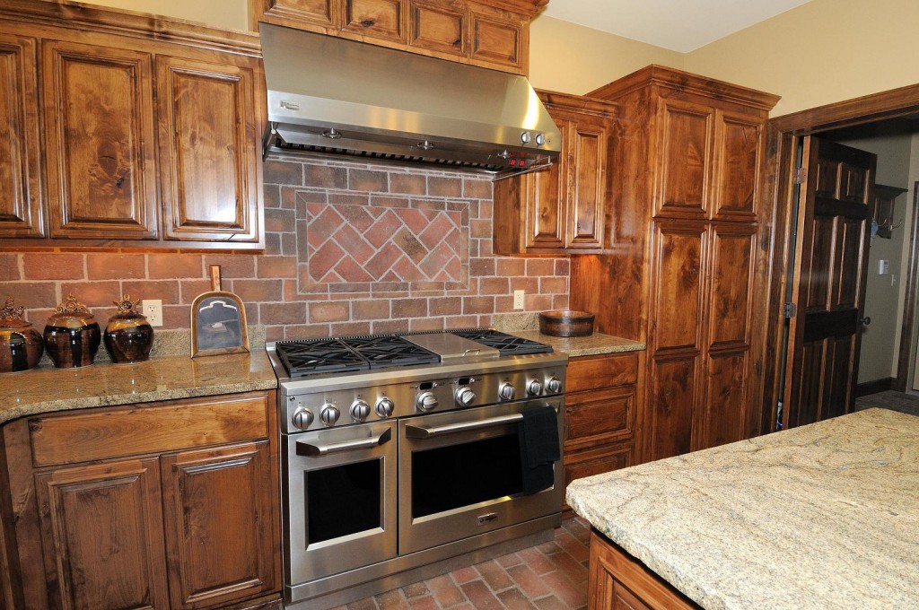 Часто применяется прием отделки кирпичной плиткой кухонного фартука. Это позволяет внести колорит в современный дизайн кухни, создать интересный контраст с современной техникой. Особенно оригинально будет смотреться плитка, выполненная под старинную кладку. Хорошо выглядят в интерьере кухни кирпичики небольших размеров, размещенные на фартуке.