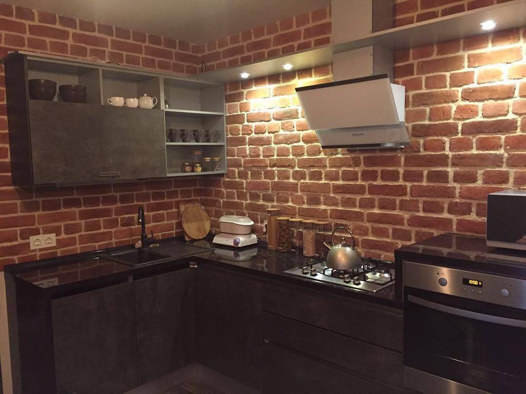 Не нужно забывать о том, что в одном пространстве можно совместить не один вид кирпичной отделки. Например, в рабочей стороне использовать прочный и влагостойкий материал, а остальные места выложить декоративным камнем из гипса или оклеить фотообоями под кирпич.