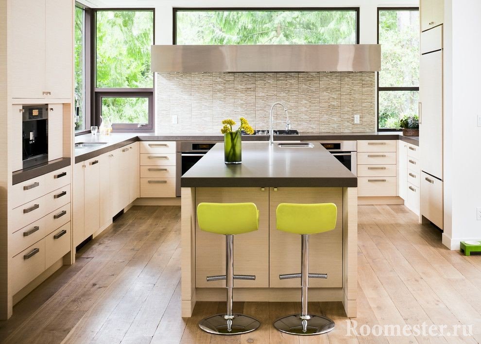 Если размеры помещения более 20 квадратных метров, то прекрасным решением станет островная форма — удобная и функциональная, но этот вариант не модульный, выполняется на заказ.