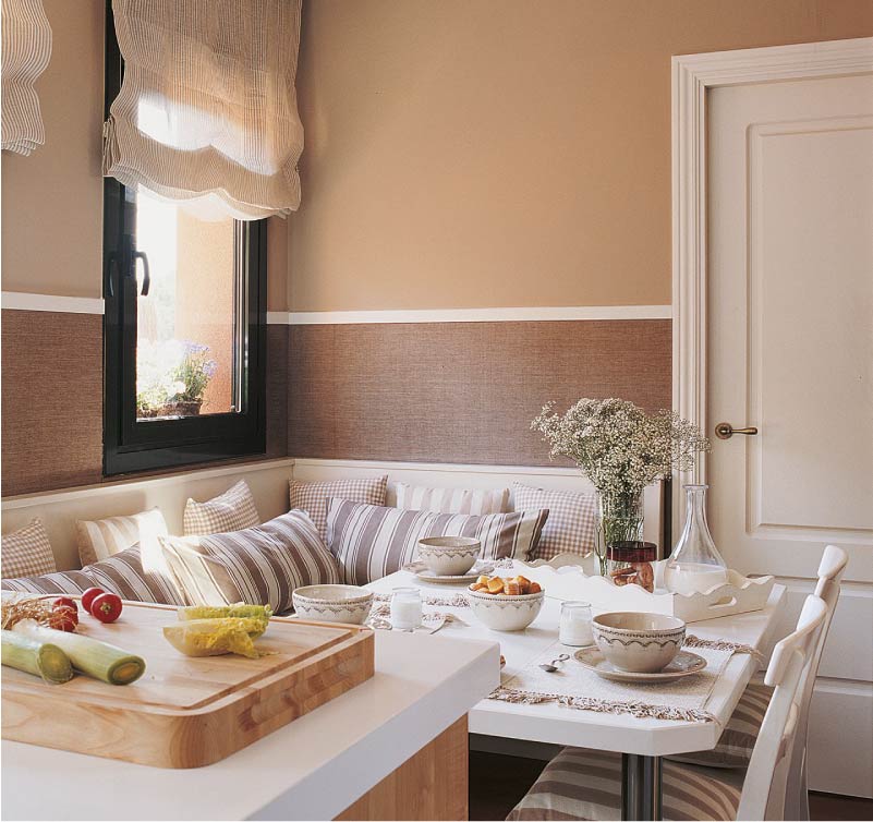 Текстиль служит и декором кухни. Цвет обивки мягкой мебели и стульев дублируют в элементах декора картинах, текстурной графики. Желательно, чтобы текстильное сопровождение было подобрано в единой гамме.