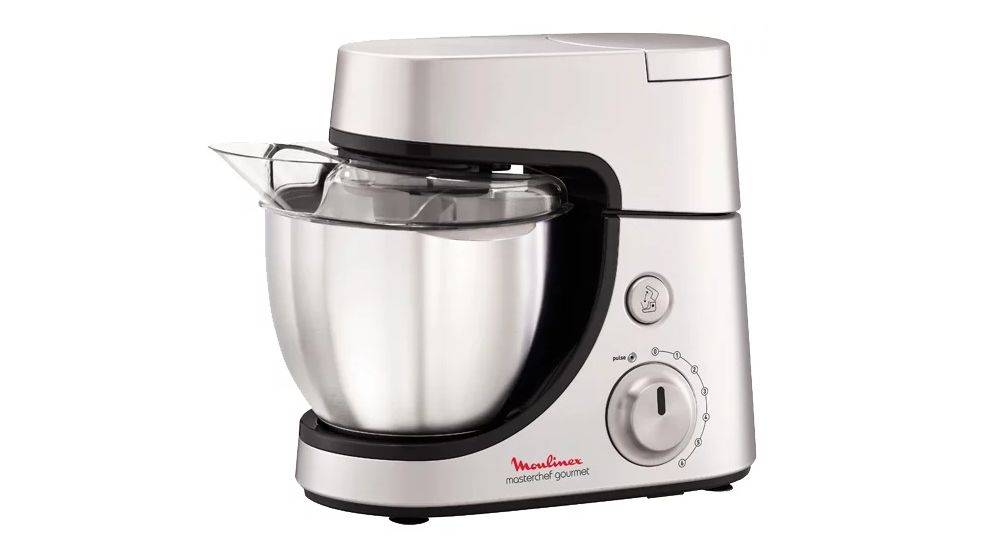 В комплекте с прибором идут две чаши: основная, с объемом 4,6 литров, и контейнер для блендера 1,5 литра. Комбайн имеет шесть скоростей и различные виды насадок, среди которых присутствует мясорубка, позволяющая приготовить мясо для различных блюд: котлет, драников, тефтелей и т.д. Также есть и другие насадки, например, мельничка, соковыжималка, блендер, крюк для замешивания теста, венчик для взбивания.