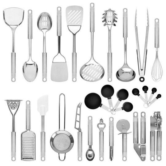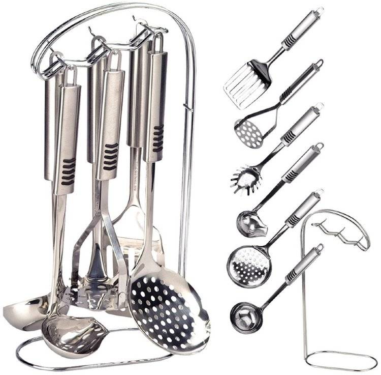 Набор кухонных принадлежностей из нержавеющей стали привлекает прочностью, твердостью, устойчивостью к высоким температурам, кислотам и щелочам. Ложкой из нержавейки можно смело перемешивать и жидкий суп, и густое рагу, не опасаясь, что она согнется или сломается. Шумовку – опускать и в кислое варенье, и в томатный сок, и в молоко.