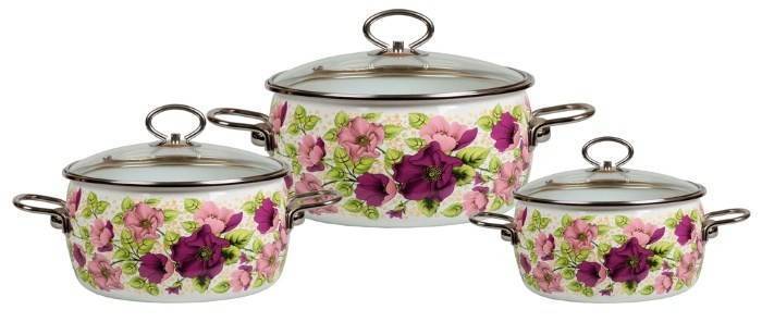 Набор изящной эмалированной посуды обычно имеет три разного объема кастрюли и ковш.
