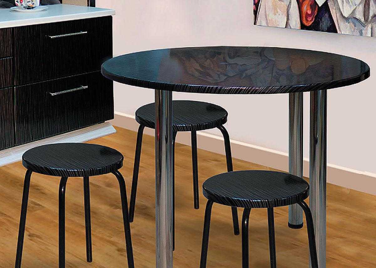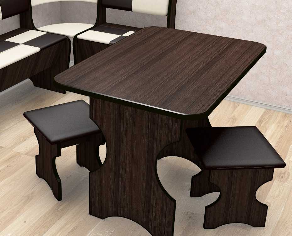 Следующее фото демонстрирует кухонный набор из обеденного стола и трех табуретов, которые повторяют практически в точности конструкцию стола.