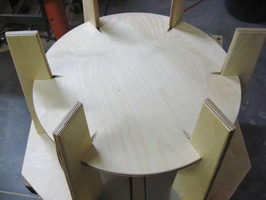На этом фото мы видим круглый стол, изготовленный из фанеры. Стоит отметить не только простоту сборки стола, но также и количество точек опоры, что дает столу большую устойчивость.