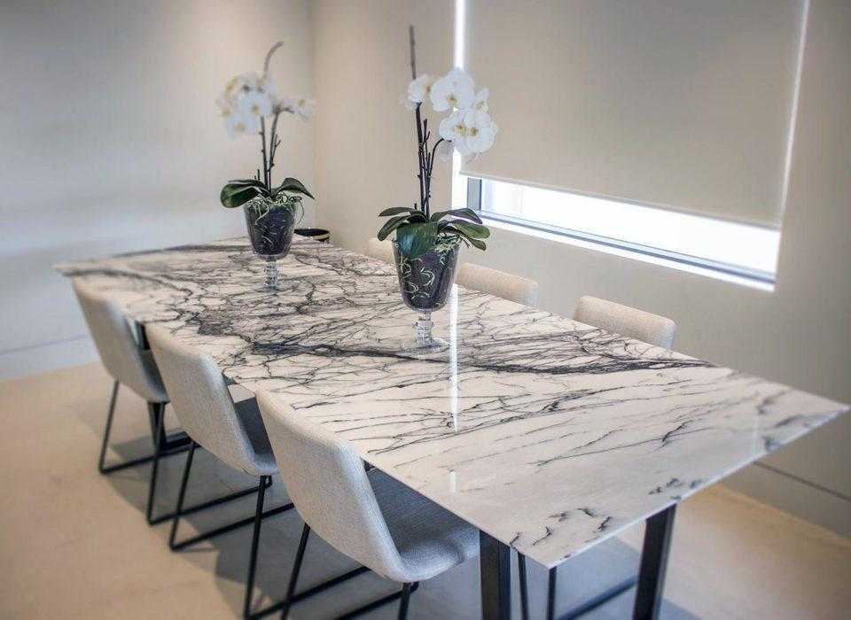 - Стекло — стеклянные столы придают современный и стильный вид. Они также легко чистятся и создают впечатление простора в помещении.