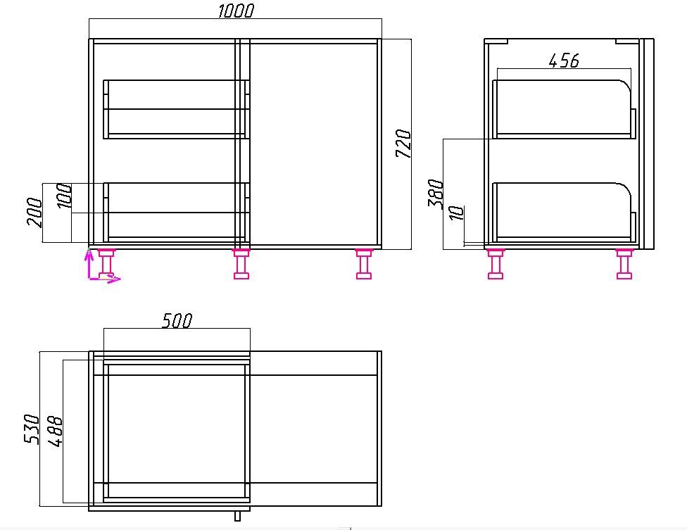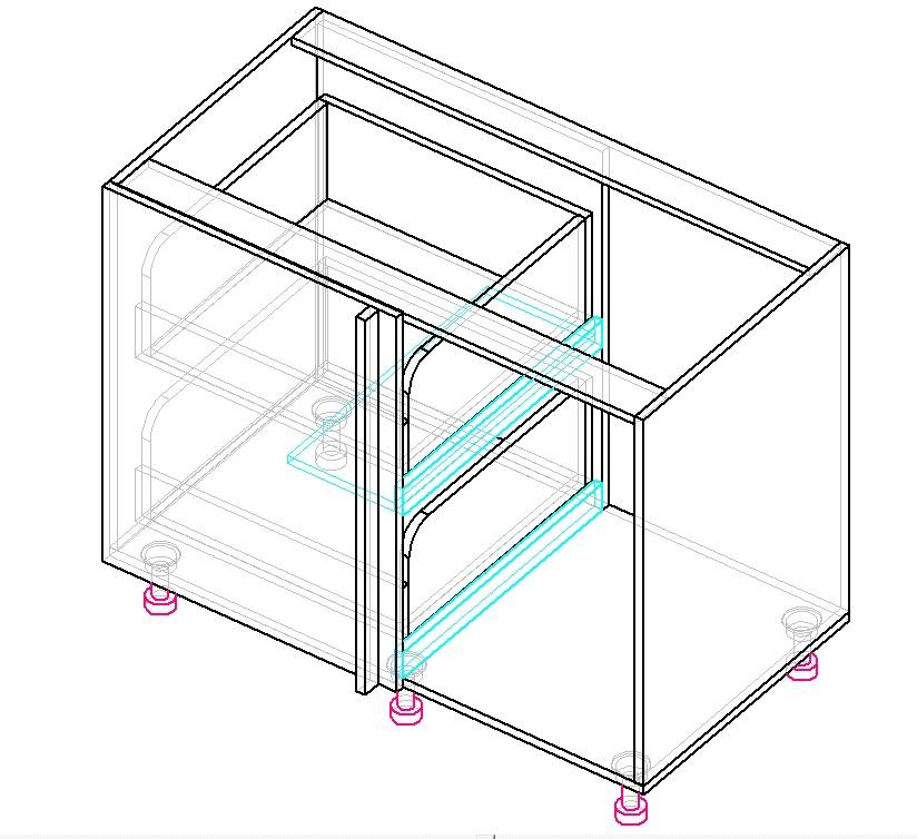 Рассмотрим конструкцию двух возможных реализаций. В первом варианте из углового модуля будут выдвигаться отдельно ящики и полки по двум уровням, а во втором – выдвижными элементами будут цельные тумбы, в которых также можно выделить ящики либо использовать для хранения полки.