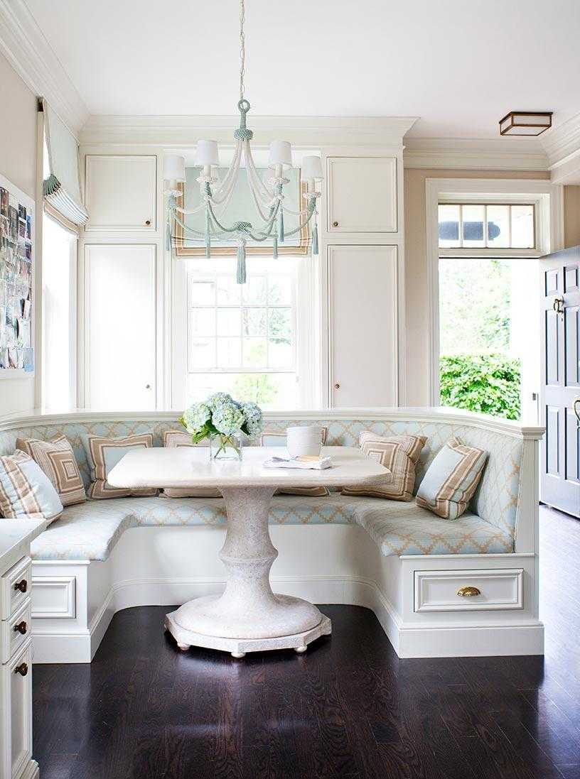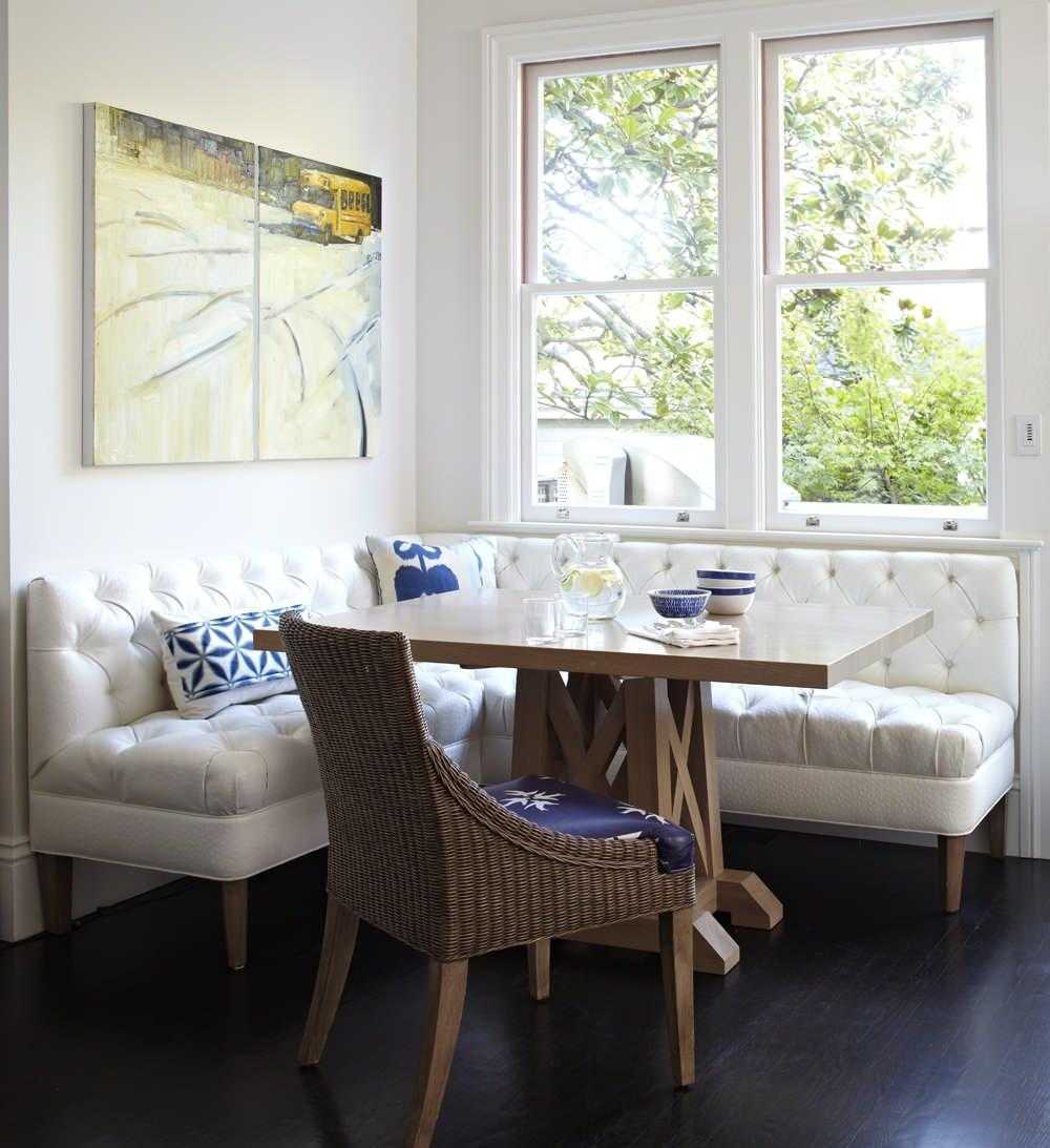 Благодаря отсутствию подлокотников и современному дизайну, кухонный диванчик вполне может посоревноваться в элегантности с диваном из гостиной.