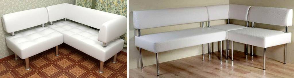 Кухонные уголки из не соединенных между собой предметов мебели (модульные, см. рис.) хороши в производстве и продаже: нет нужды делать правые и левые исполнения. Ценят их и любители часто переставлять мебель; модульные кухонные уголки неплохо смотрятся в квартирах-студиях лаконичных стилей, таких как лофт, хайтек, минимализм. Но функционал с эргономикой у модульных кухонных уголков, попросту говоря, никакие – ничего в них не положишь, и сидеть в углу неудобно.