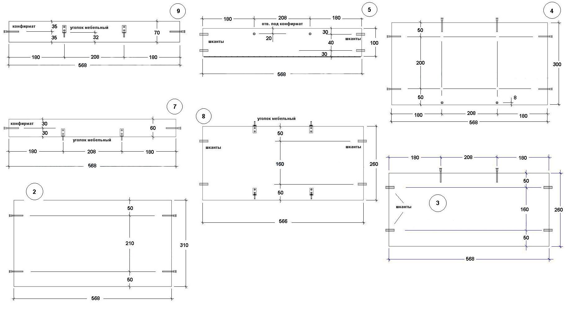 - Размечают боковины и вырезают по чертежам в двух экземплярах. Отмечают и высверливают места для конфирматов и шкантов.