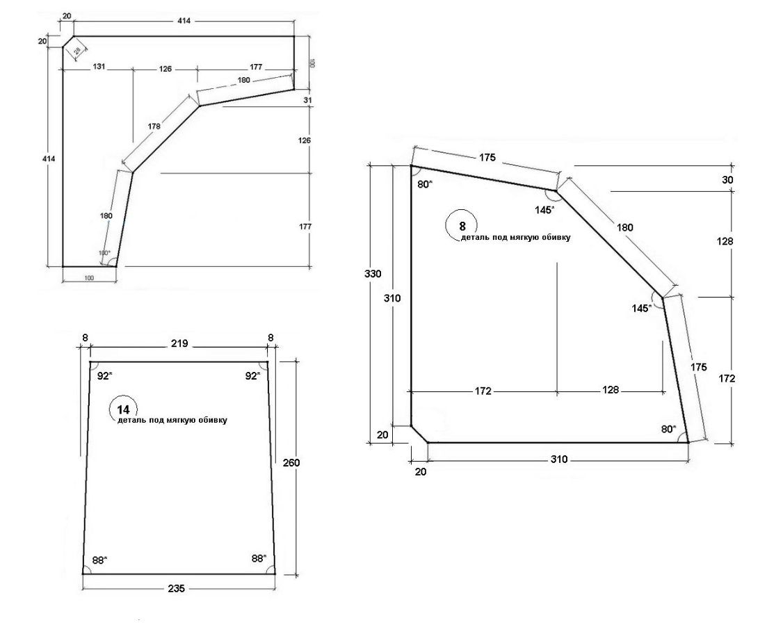 Первоначально нужно нарисовать подробную схему со всеми размерами своей будущей мебели. Она будет состоять из трех основных элементов: угла и двух приставных диванов.