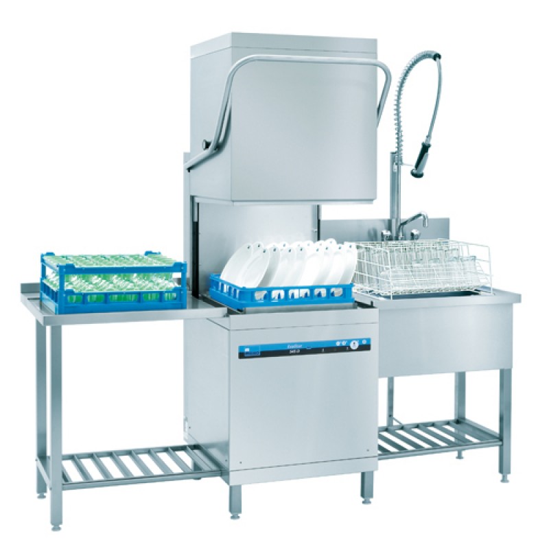 Купольная посудомоечная машина, «работающая» только с утварью размером до 24 см. Не слишком экономичная, как в плане расхода воды на цикл (3 л), так и по энергопотреблению (мощность 16,3 кВт). Однако эта модель идет уже в комплекте со столами, ручной мойкой и душем для первичной очистки посуды, допускает подключение к системе ГВС и стоит дешевле зарубежных аналогов – 128 000 руб.