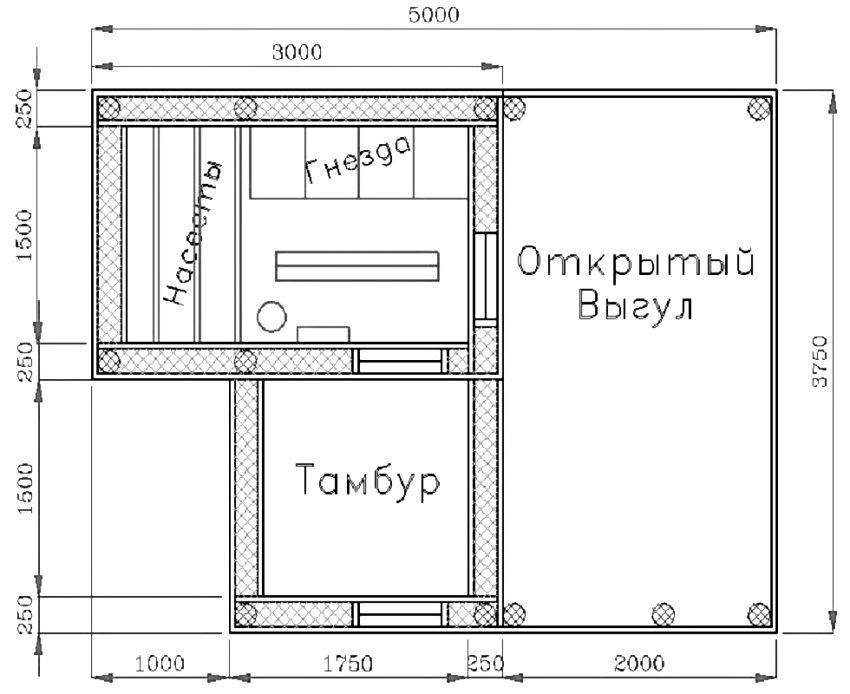 - 8 кв. м с двумя помещениями – в одном располагаются гнезда для высиживания яиц, в другом находятся перекладины для ночевки. Дворик для выгула примыкает к любому из помещений и желательно, чтобы был частично закрыт крышей, огорожен металлической сеткой.