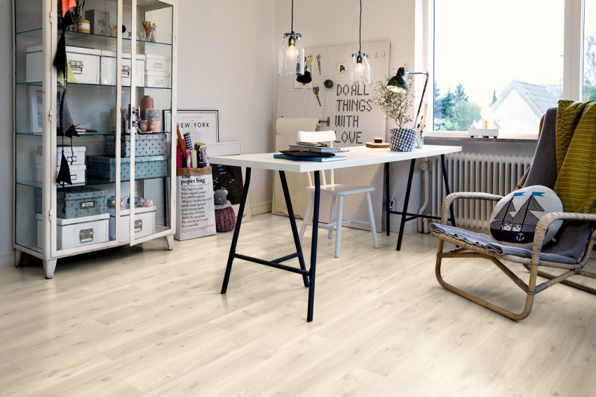 Для остальных помещений (детская, спальня, гостиная) больше подходит классический вариант ламината: по сроку эксплуатации не уступает кварцвинилу, прекрасно смотрится и, главное, значительно дешевле. Однако, в детскую комнату, с ее шумом и гамом, буквально просится кварц-винил, который заглушает шумы.